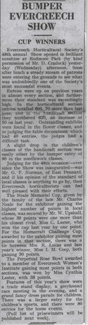 The Neale Memorial Cup, given by the family of the late Mr Charles Neale for the exhibitor gaining the highest number of points in local classes, was secured by Mr W Upshall, whose 39 points were one more than his closest rival, Miss C Lester, who won the cup last year by one point. For the Homecraft Challenge Cup, awarded to the exhibitor gaining most points in that section, there was a tie between Mrs R Lucas and las year’s winner, Miss I M Corp, both gaining 30 points.